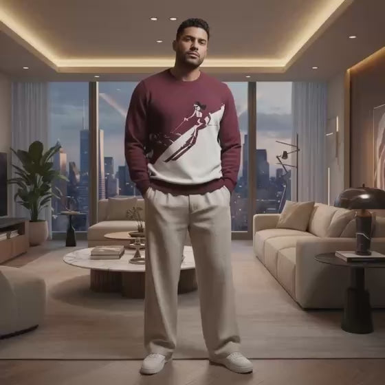 The Wine to Assets Knit Sweater pairs a bold front design of a skier gliding down a snow-dusted Pyrenees slope with a striking knit texture that captures motion, freedom, and mountain energy.